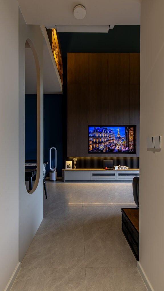 The unique 6-metre-high ceiling sets the stage for a stunning transformation — a cosy loft that not only adds a functional study nook but also elevates the entire space. This impressive height allowed us to design a spectacular TV feature wall that becomes the focal point of the home.