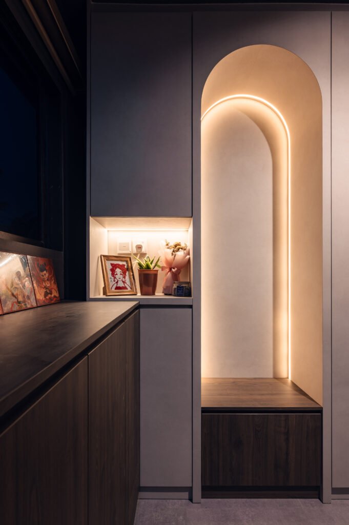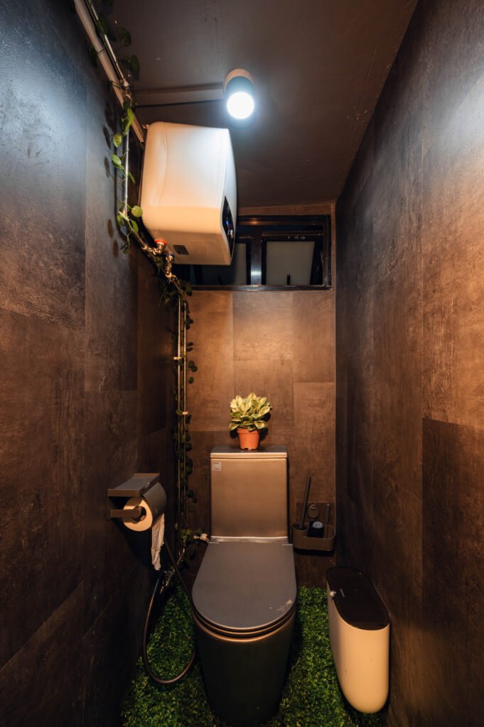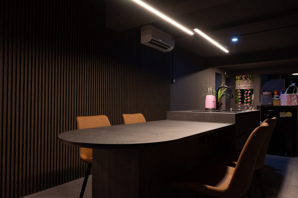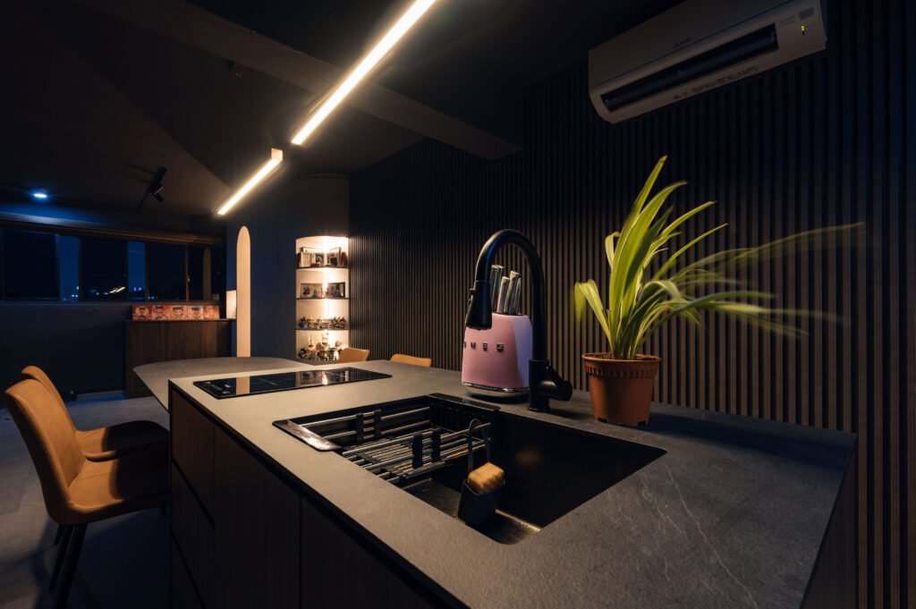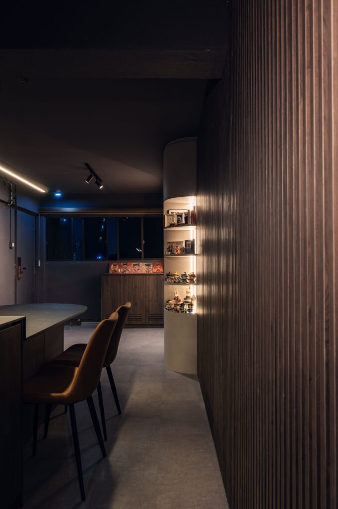 This home embodies bold industrial elegance, defined by dark grey tones, textured finishes, and warm wood accents. The open-concept washrooms add a touch of modern uniqueness, blending seamlessly into the overall design for a cohesive, loft-inspired feel. Subtle lighting and fluted panels soften the rugged aesthetic, creating a perfect balance between raw character and refined comfort.