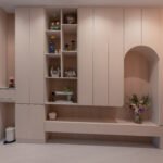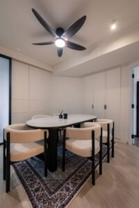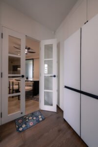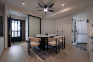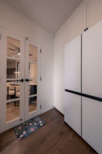 To further improve the layout, a sliding door was introduced to separate the foyer from the dining area. This design element helps define different zones within the home while still preserving the open and airy feel of the living space. When closed, it provides privacy and visual separation; when open, it allows the living and dining areas to flow naturally together.