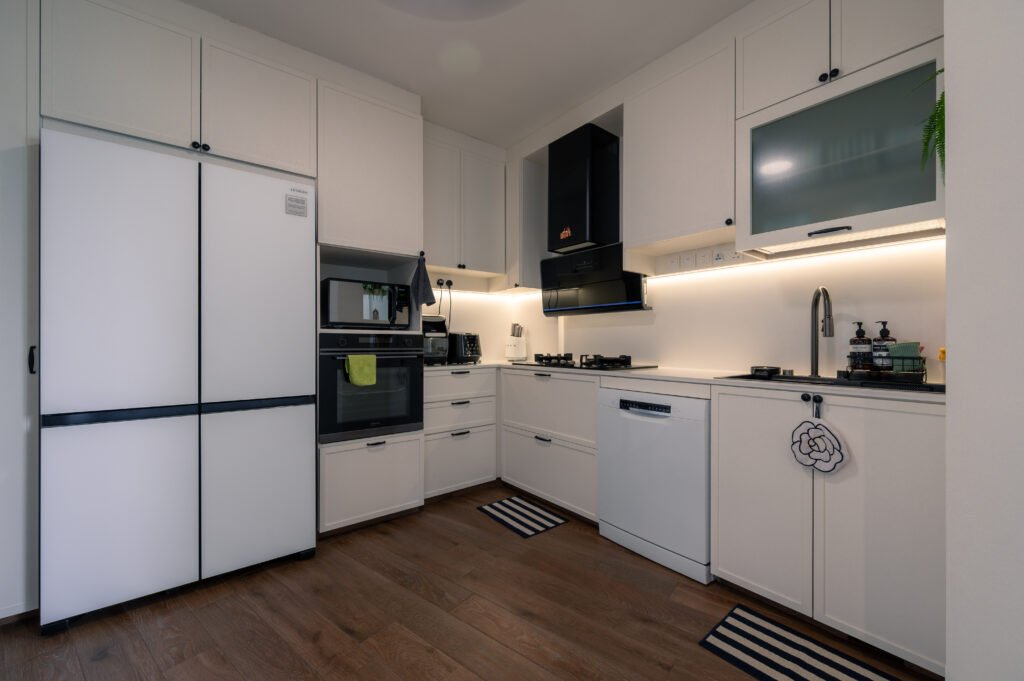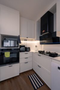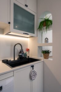 This Tampines Courtview home features a modern barnhouse-inspired kitchen, designed with a timeless black and white palette that balances rustic charm with contemporary sophistication. The space combines clean architectural lines with farmhouse character, creating a kitchen that feels both warm and striking.