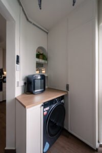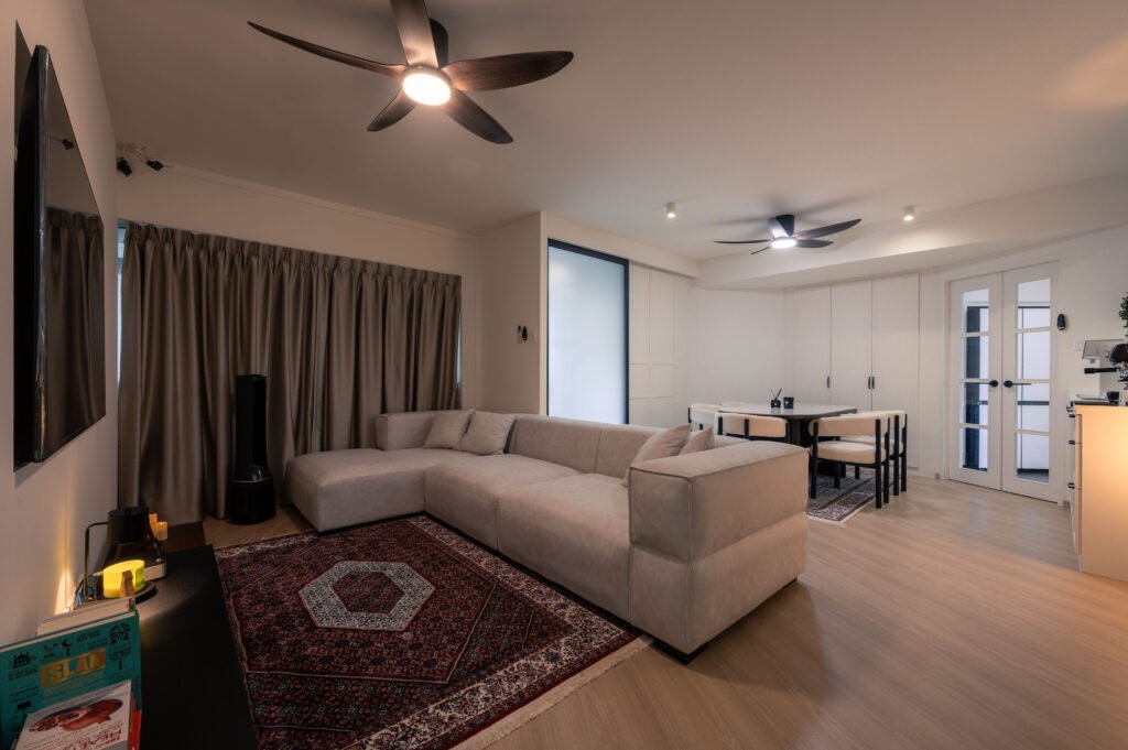 One of the standout features of this living room is its generous built-in storage solutions. Custom carpentry has been thoughtfully integrated throughout the space, allowing the homeowners to keep everyday items neatly tucked away while maintaining a clean and uncluttered look. The seamless cabinetry blends into the walls, enhancing the overall minimalist aesthetic while maximising functionality.
